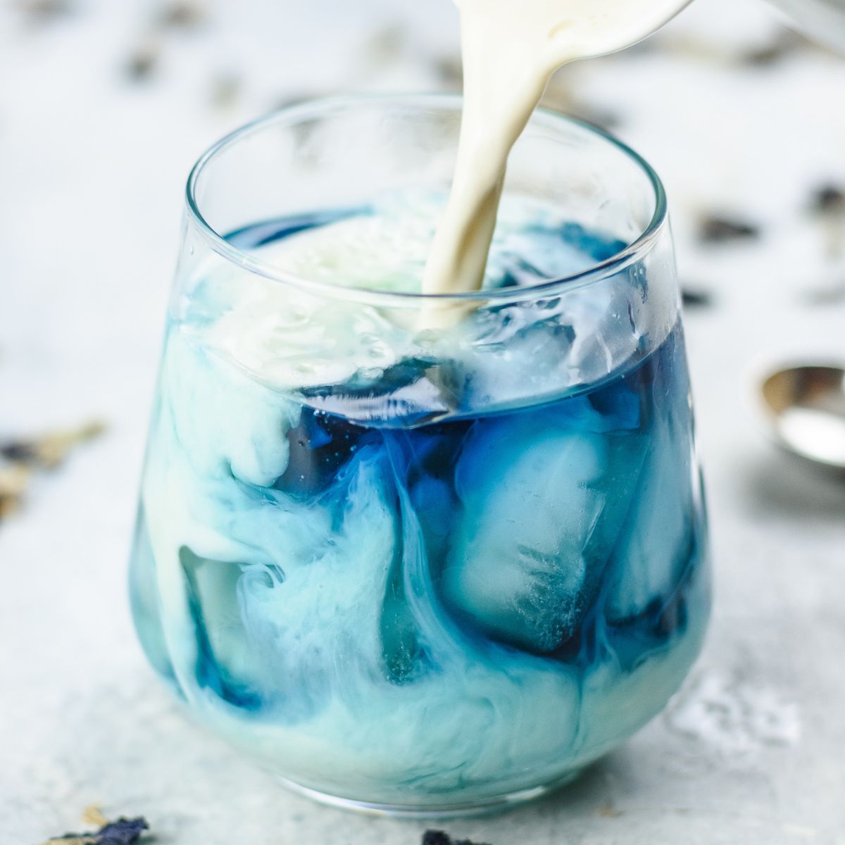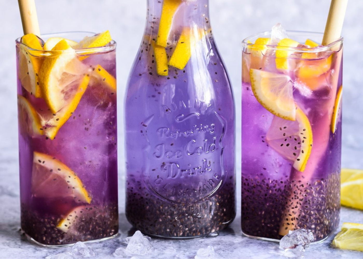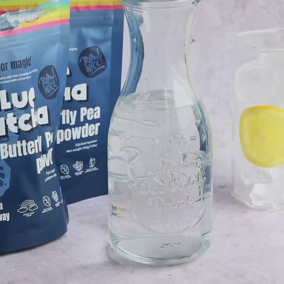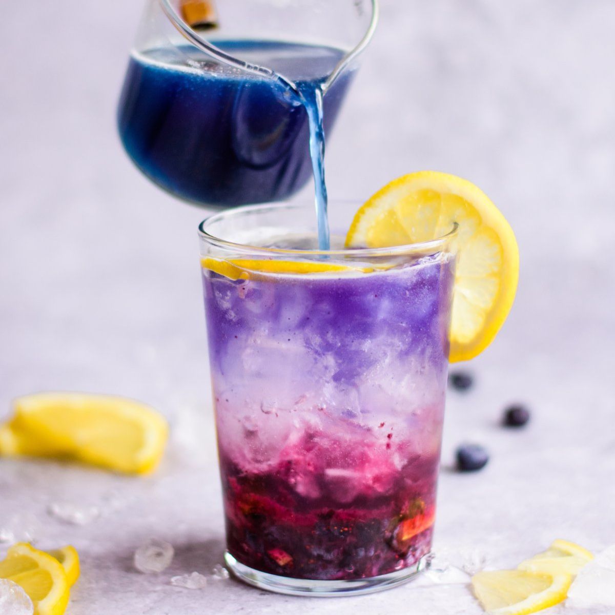 - Mix with a fruit infused drink for a lovely blue shade. Then add lemon juice to change color of your drinks from blue to purple.